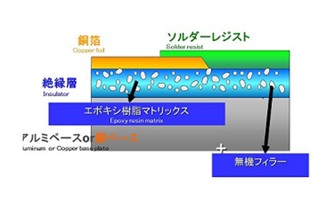 此產(chǎn)品是在鋁基底上形成經(jīng)過高度填充導熱性高的無機填充料的環(huán)氧樹脂類絕緣層與導體箔而構成,實現(xiàn)了與氧化鋁陶瓷基板具有同等以下熱阻的高導熱性金屬基底基板。